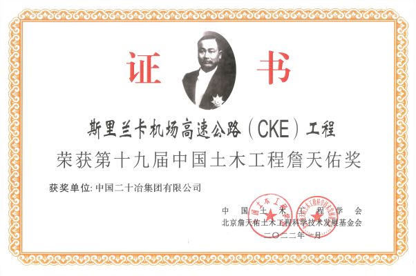 9月5日,第十九屆中國土木工程詹天佑獎頒獎大會在北京召開,斯里蘭卡機場高速公路(CKE)工程作為中國二十冶“一帶一路”上建造唯一的市政工程獲此殊榮。